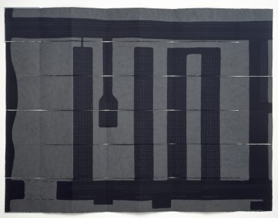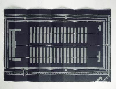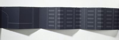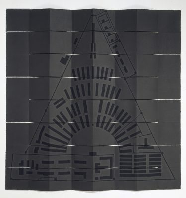 Drei Leporellos, schwarzes handgeschöpftes Büttenpapier mit grauem aufgegossenem Grundriss des Konzentrationslagers Birkenau aus pigmentierter Papiermasse Seitengröße: 31 x 31 cm, Leporellogröße: 31 x 2600 cm, Gesamtgröße (als Fläche ausgefaltet): 250 x 405 cm Auflage: 10 Exemplare 1995