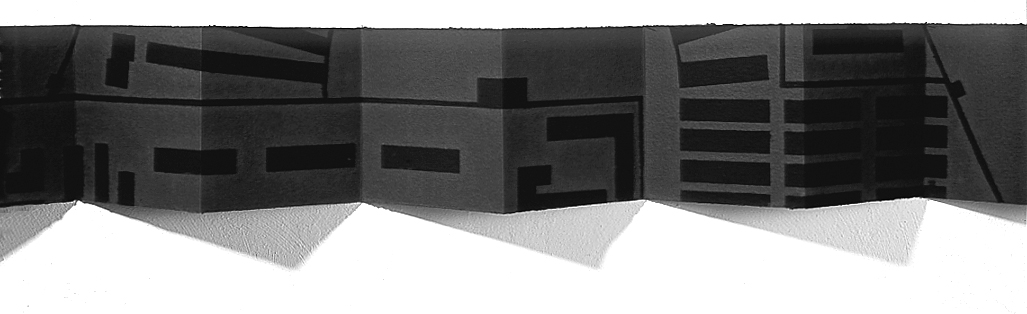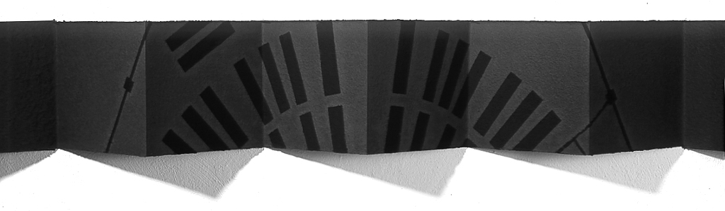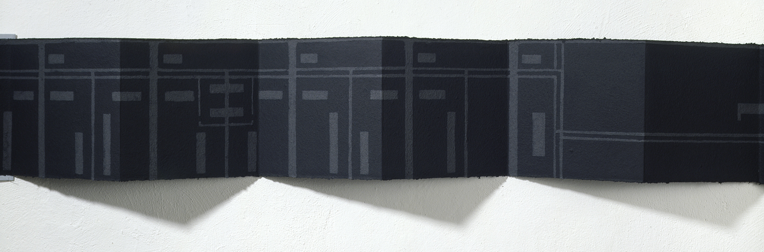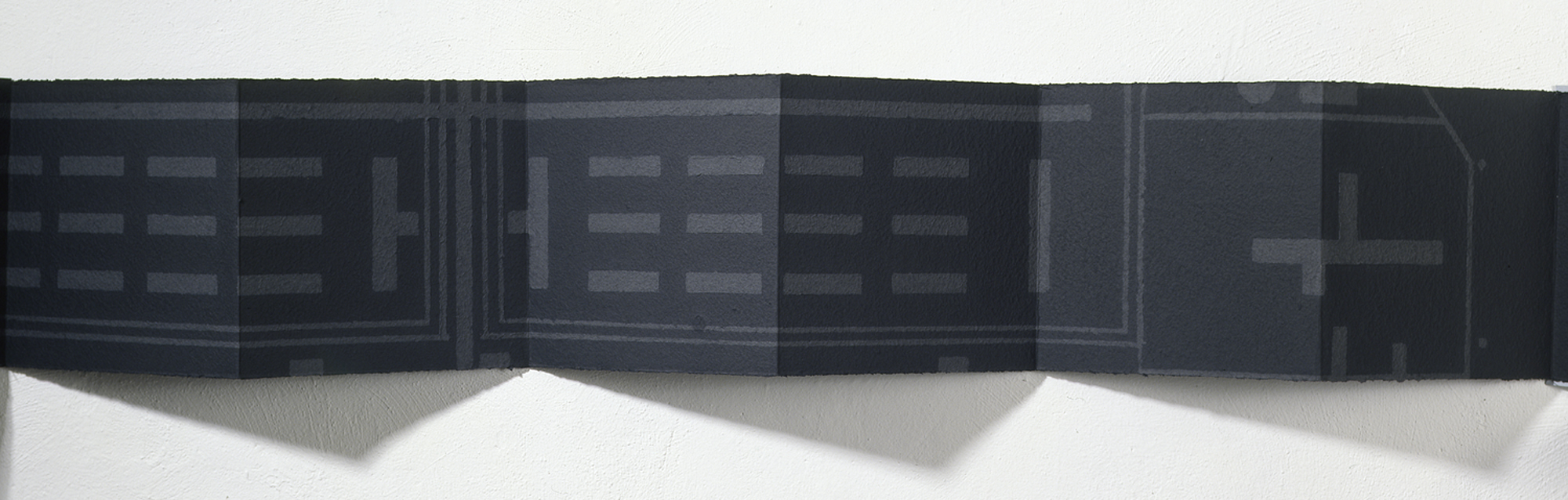 Drei Leporellos, schwarzes handgeschöpftes Büttenpapier mit grauem aufgegossenem Grundriss des Konzentrationslagers Birkenau aus pigmentierter Papiermasse Seitengröße: 31 x 31 cm, Leporellogröße: 31 x 2600 cm, Gesamtgröße (als Fläche ausgefaltet): 250 x 405 cm Auflage: 10 Exemplare 1995