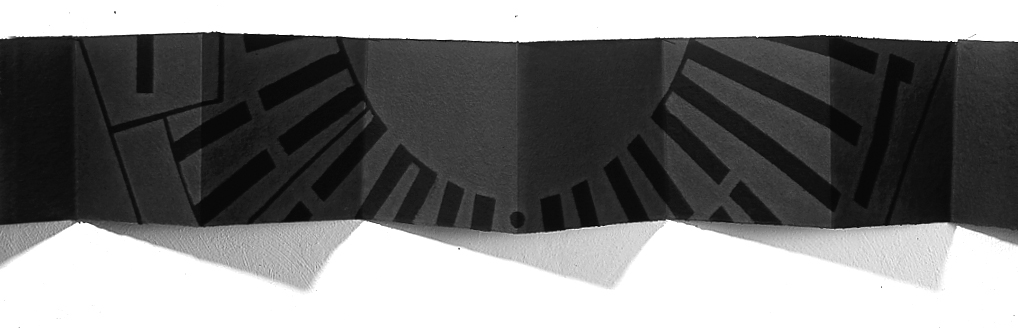 Sachsenhausen Leporello, schwarzes handgeschöpftes Büttenpapier mit grauem aufgegossenem Grundriss des Konzentrationslagers Sachsenhausen aus pigmentierter Papiermasse Seitengröße: 23 x 23 cm, Leporellogröße: 23 x 1300 cm, Gesamtgröße (als Fläche ausgefaltet): 187 x 187 cm Auflage: 10 Exemplare 1995 |