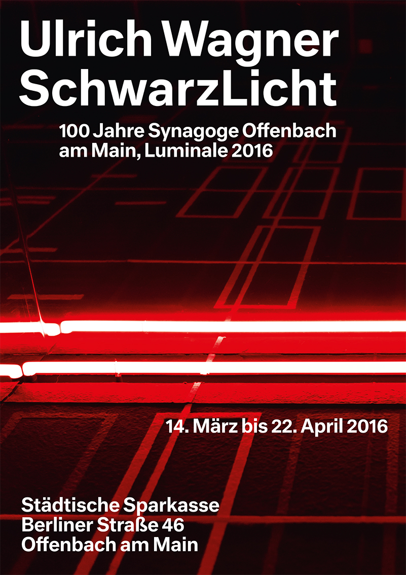 100 Jahre Synagoge in Offenbach geben Anlass zu einer künstlerischen Rückblende auf die Geschichte des Nationalsozialismus. Grundrisse und Pläne historisch bedeutsamer Gebäude, insbesondere im Zusammenhang der Geschichte des Nationalsozialismus, verwandeln sich zu Anordnungen leuchtstarker Farbzeichen im Raum. Ein im Zickzack gebauter, schwarzgrundiger aber leuchtender Kubus, aus großformatigen, handgeschöpften Papierbahnen und Leuchtstoffröhren komponiert, wird zum labyrinthischen Gang durch die Erinnerung an Vernichtung und Tod. Durch seine Zeichensprache und Beleuchtung wandelt Ulrich Wagner faktische Wahrnehmung in visuelle Animation. Der Künstler agiert subtil mit formaler Strenge, der Sinnlichkeit von Licht und der Stofflichkeit seiner Papiere. Die Atmosphäre entsteht in der Ambivalenz von geschichtlicher Reflexion und ästhetischen Setzungen; eine irritierende Schwebe zwischen dem Schönen und dem Wahren.